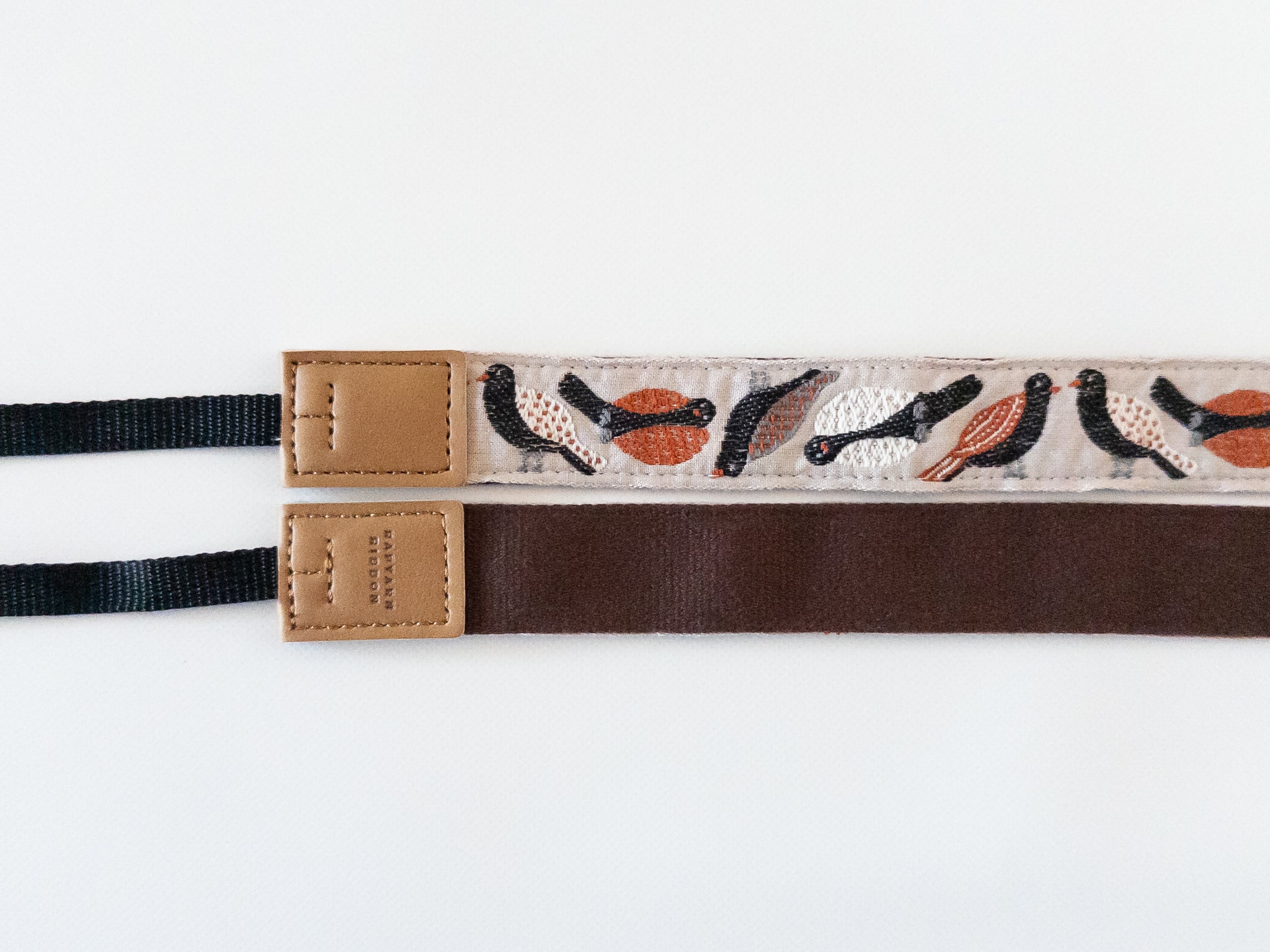 羽の部分に様々な模様のある鳥たちを描いた可愛すぎるカメラストラップ!