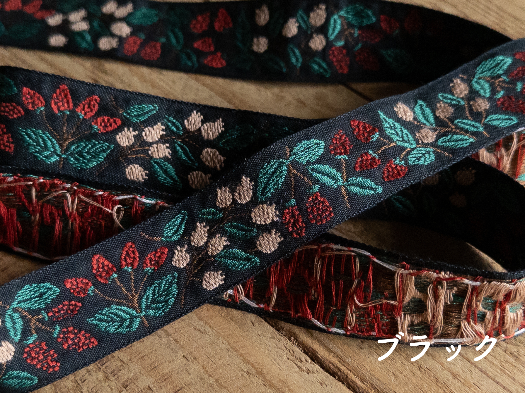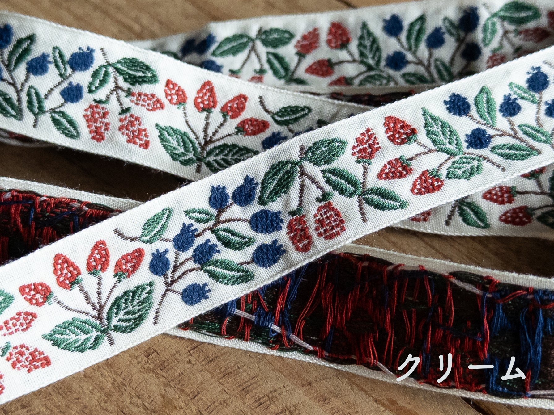 いちご、ラズベリー、ジューンベリーが並んだ25mm幅のリボン。落ち着いた色味の中に、小さな果実のかわいさがぎゅっと詰まっています。