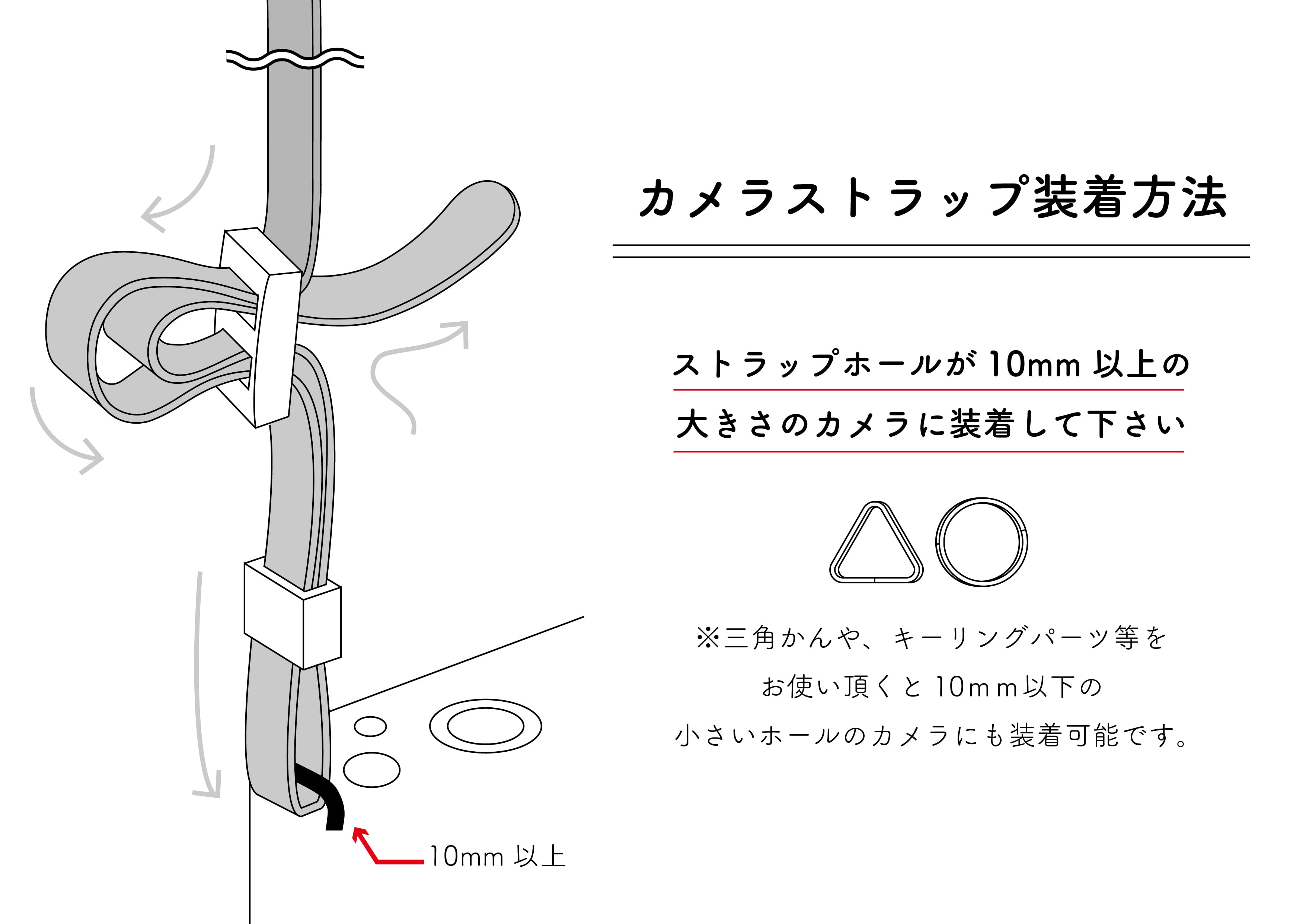 また、ホールの大きさが10mm未満の場合は、別売りの「カメラ用三角リング」、「キーリングパーツ」などをご使用いただくことで、アンティークカメラなど様々な機種のカメラに装着可能になります。
